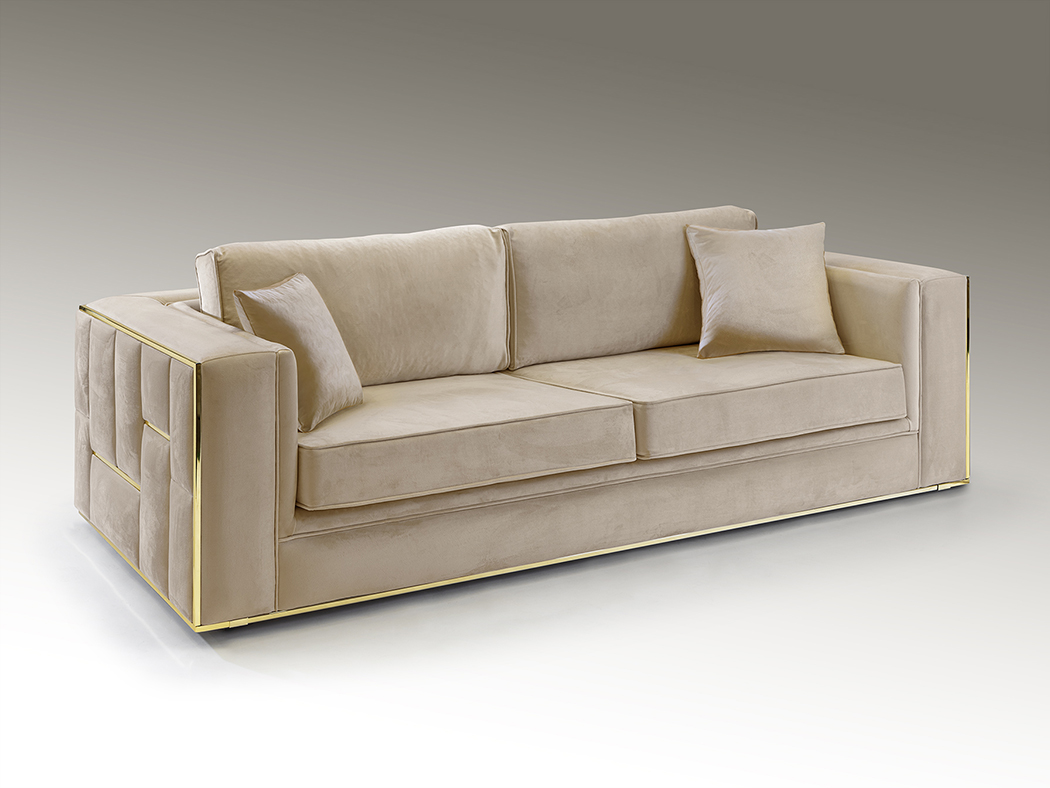 Sofá de 3 lugares, estofado em veludo bege, almofadas combinando. Pratos decorativos em acabamento cromado. Tecido 100% poliéster de 320 gr/m². Estrutura de madeira de faia. Enchimento com espuma de borracha de 36 kg/m³ e fibra oca.