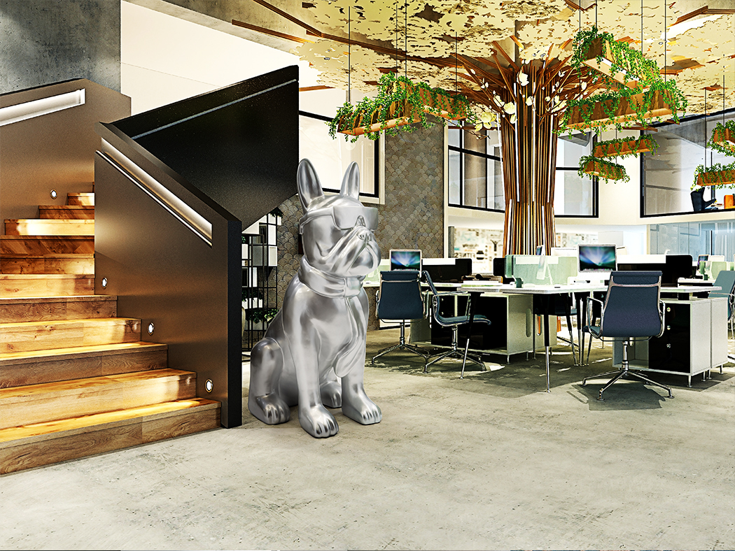 Figura de bulldog francês tamanho grande, realizada em fibra de vidro e poliéster. Apta para exterior. Decoração: Pintura prateada.