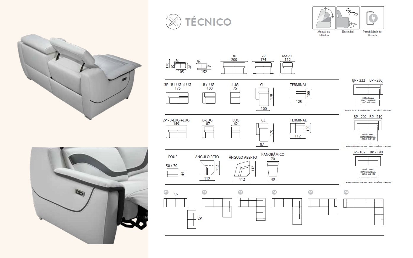Dimensões = 200 L x 105 P x 90/110 A cm.