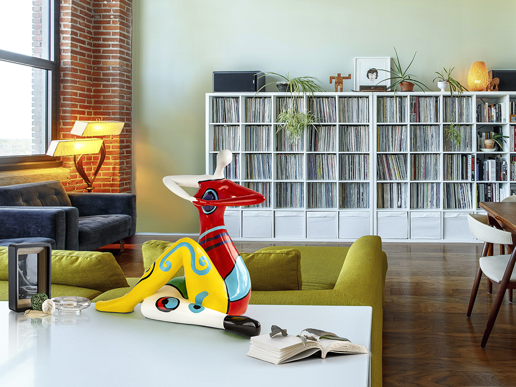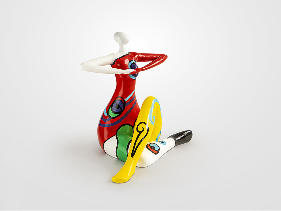 Figura de mulher, tamanho médio, realizada em resina. Decoração POP..