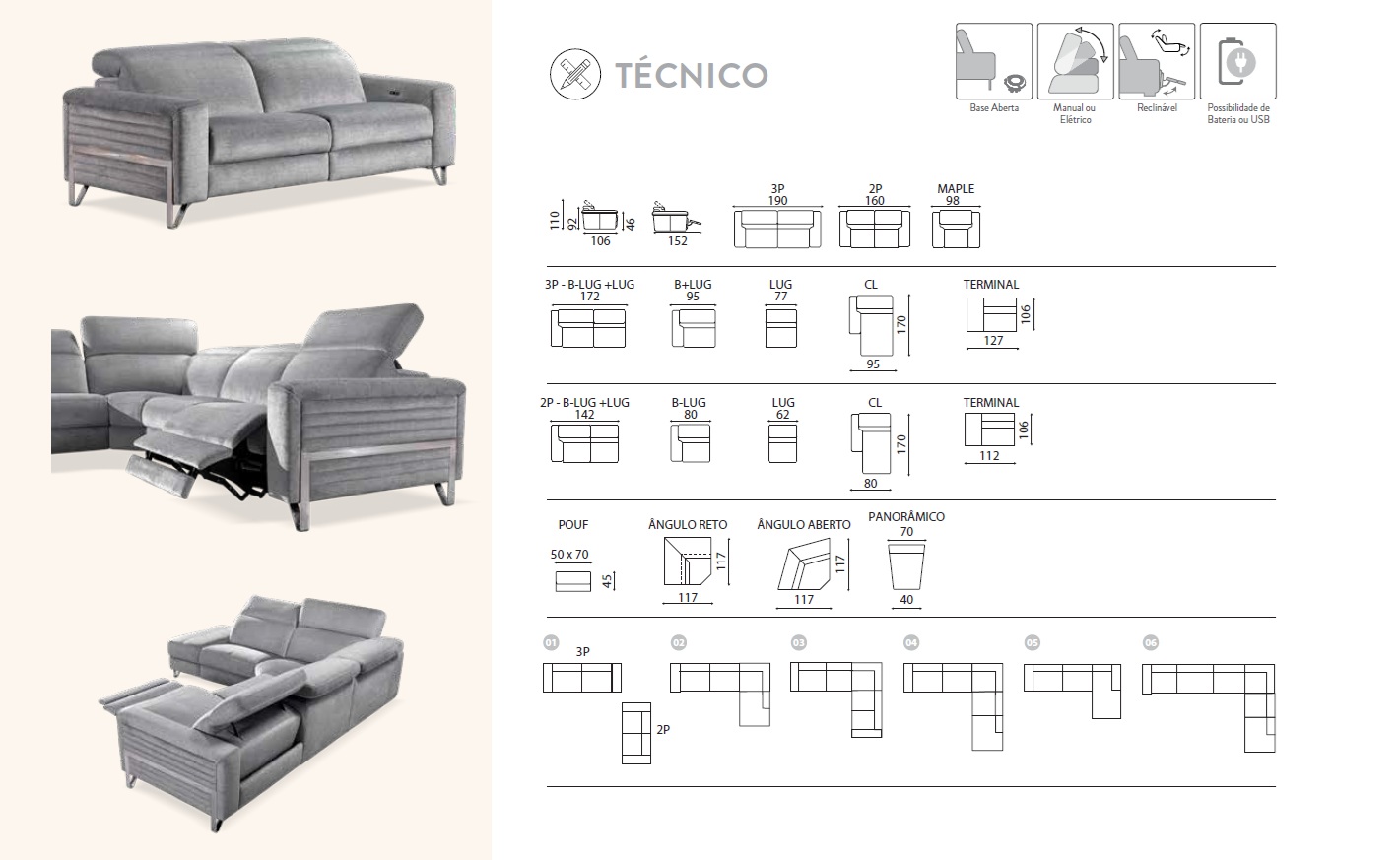 Dimensões = 289 L x 229 P x 92/110 A cm.