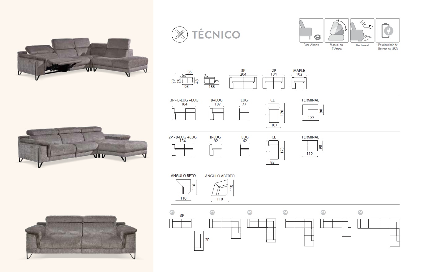 Dimensões = 294 L x 237 P x 78/98 A cm.
