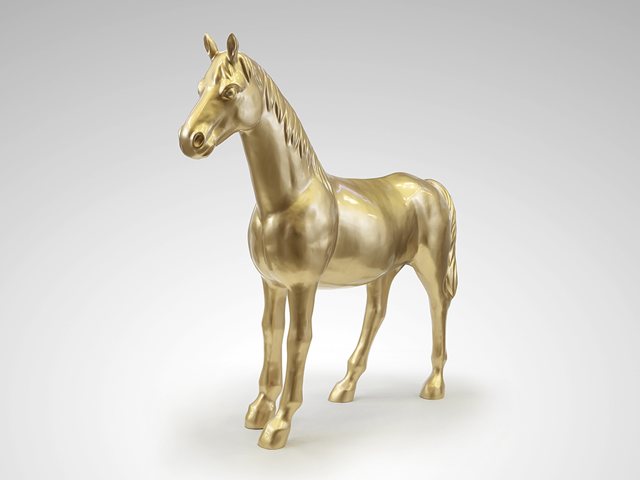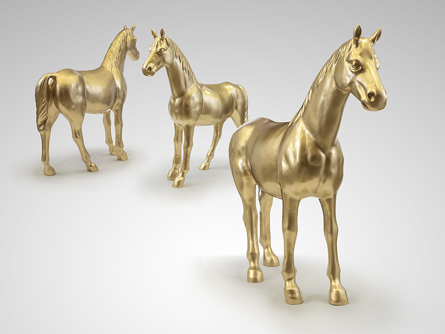 Figura de cavalo tamanho grande, realizada em fibra de vidro e poliéster. Apta para exterior. Decoração: Pintura dourada.